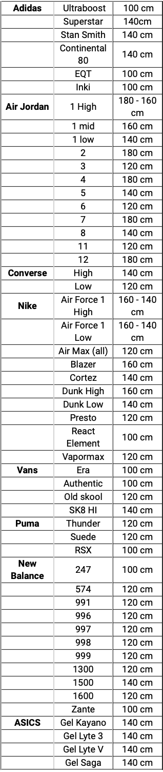 Den simpleste måde, at finde den korrekte længde af snørebånd til dine sneakers på, er ved blot at måle de gamle. Du kan lægge lidt til eller trække lidt fra i længden, såfremt du synes, at dine nuværende snørebånd er en forkert længde.
