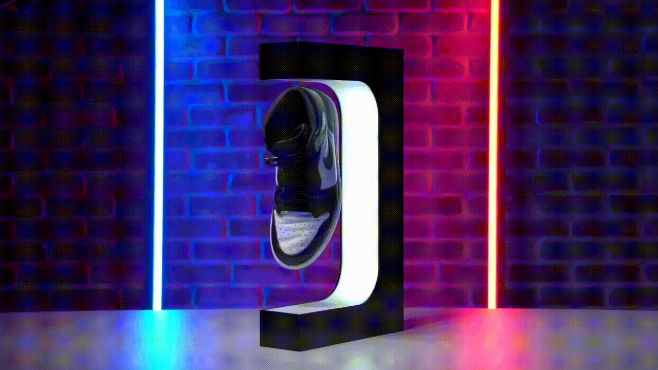Vis dine sneakers frem som aldrig før med vores svævende display. Dette unikke system bruger elektromagneter til at få dine sko til at svæve, og de integrerede LED-lys fremhæver hver eneste detalje. Dine sneakers vil altid se fantastiske ud og fange opmærksomheden, uanset hvor du placerer displayet.