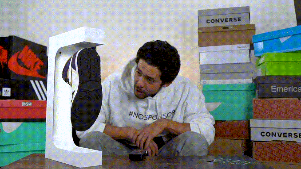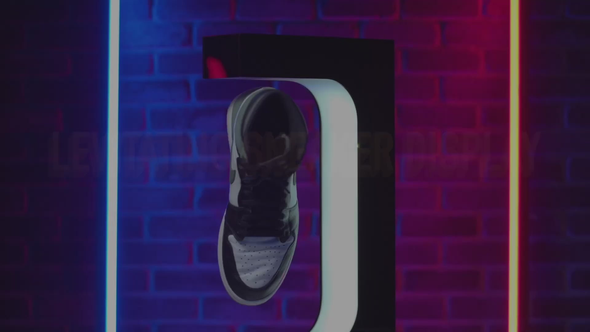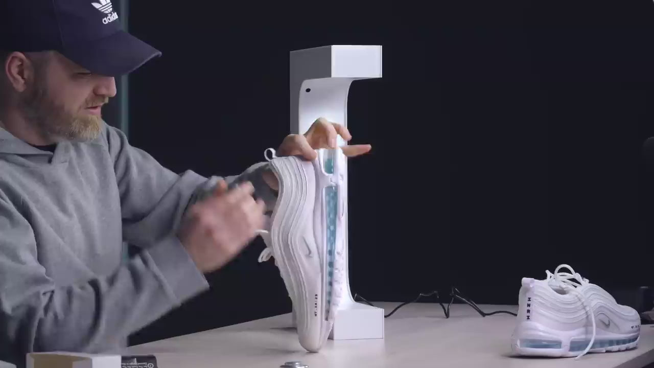 Med elektromagneter holder vi dine sneakers svævende i luften, hvilket giver dem et futuristisk look. LED-belysningen fokuserer også på skoene, så de bliver set i det rette lys. Displayet fungerer ved at du sætter en magnet i hælen af skoen og så er der en i standeren, hvilket gør at skoene svæver uden brug af noget andet.